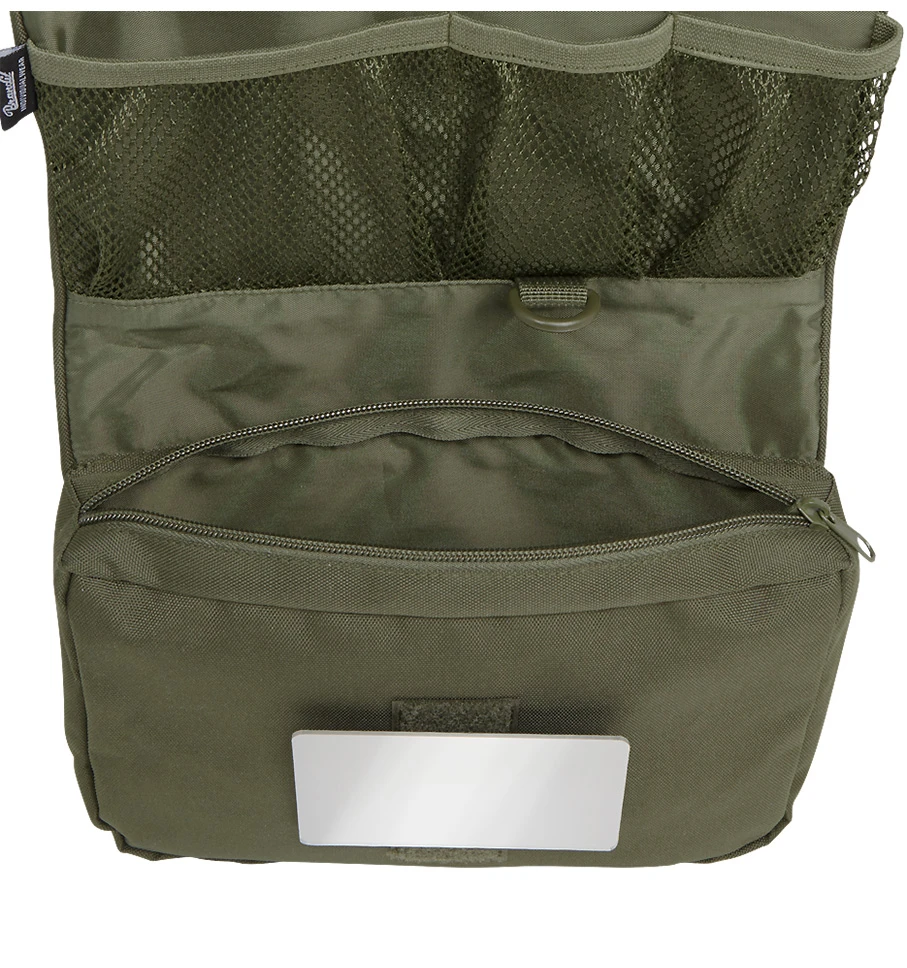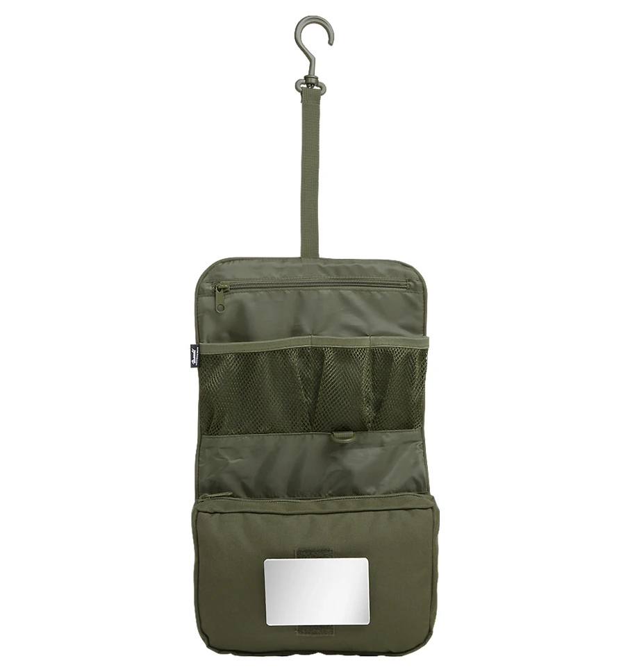 Ein besonderes Highlight der Brandit Toilettentasche ist der abklettbarer, bruchsicherer Spiegel, der immer griffbereit ist und Dir auch unterwegs ein perfektes Styling ermöglicht. Der drehbare Kunststoff-Haken zum Aufhängen sorgt dafür, dass Du die Tasche überall bequem aufhängen kannst.