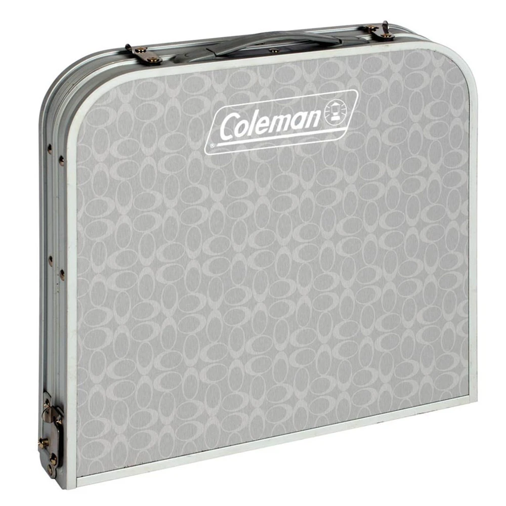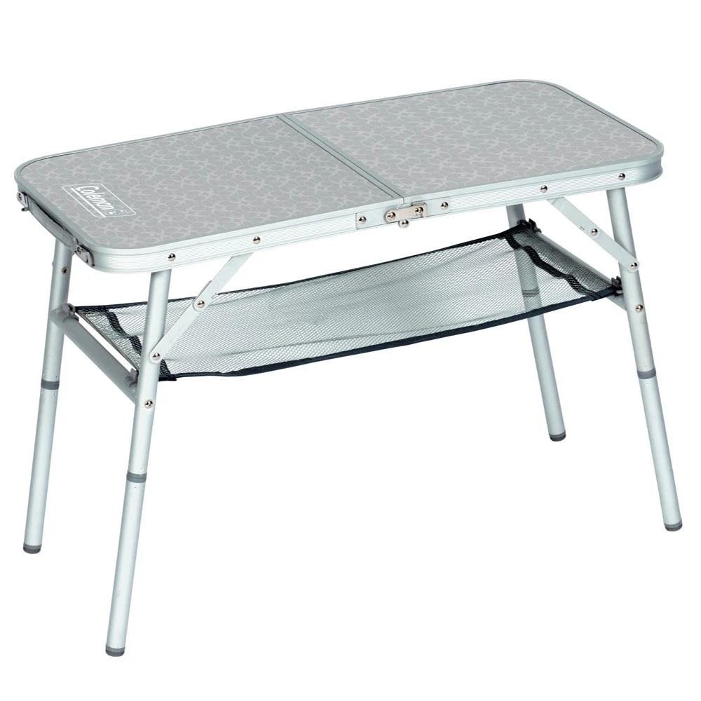Der Coleman Falttisch Mini Camp silberfarben ist ideal für zwei Personen. Er kann einfach zusammengelegt und mit den integrierten Griffen transportiert werden. Außerdem ist er in der Höhe verstellbar. Während der Rahmen aus Aluminium Stabilität gibt, bietet die Netzablage unter der Tischplatte Ablagefläche.