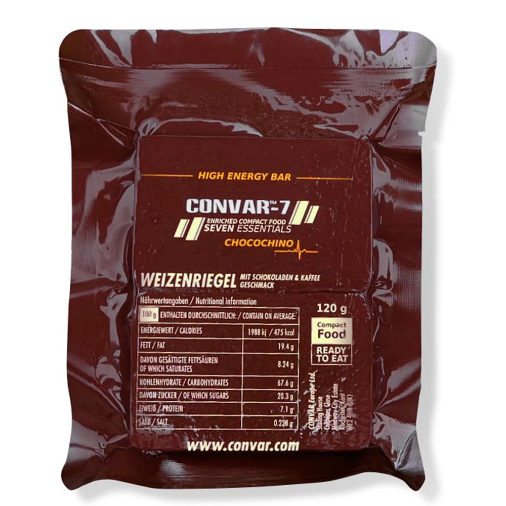 Der Convar-7 High Energy Bar Chocochino überzeugt mit gutem Geschmack, robuster Verpackung und langer Haltbarkeit. Er versorgt Sie mit der benötigten Energie und eignet sich sowohl als Snack beim Trekking und anderen Ausflügen wie auch für die Krisenvorsorge, als Notnahrung oder als Backup im Rucksack oder Auto. Hier in praktischer Packung mit 108 Riegeln.
