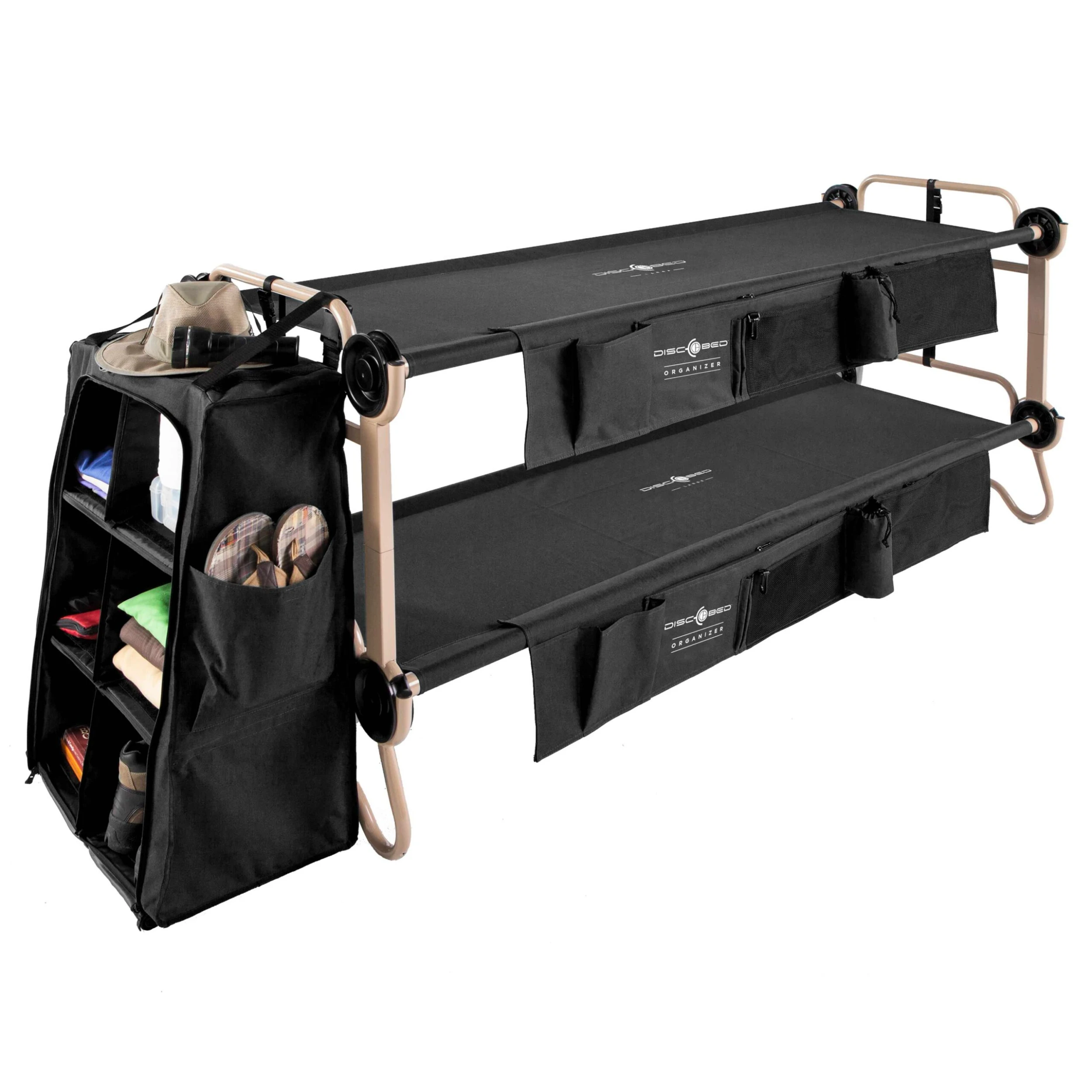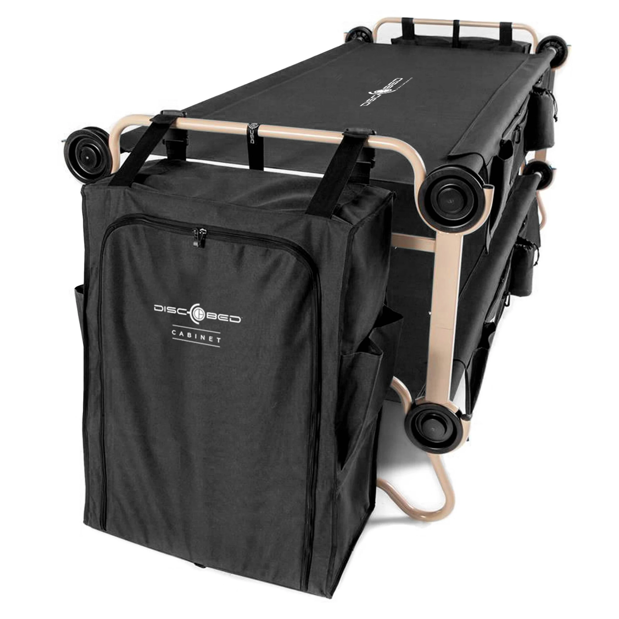 Der praktische mobile Kleiderschrank lässt sich mittels Gurten am Feldbett anbringen. So haben Sie selbst unterwegs auf Camping-Reisen oder Ihre Gäste genügend Platz, Ausrüstung und Bekleidung sinnvoll unterzubringen. Die Innenfächer ermöglichen die individuelle Beladung der Garderobe, können aber auch leicht herausgenommen werden. Platzsparend zusammengefaltet und in passender Tragetasche verstaut, ist das Disc-O-Bed Cabinet die ideale Vervollständigung zum Feldbett.