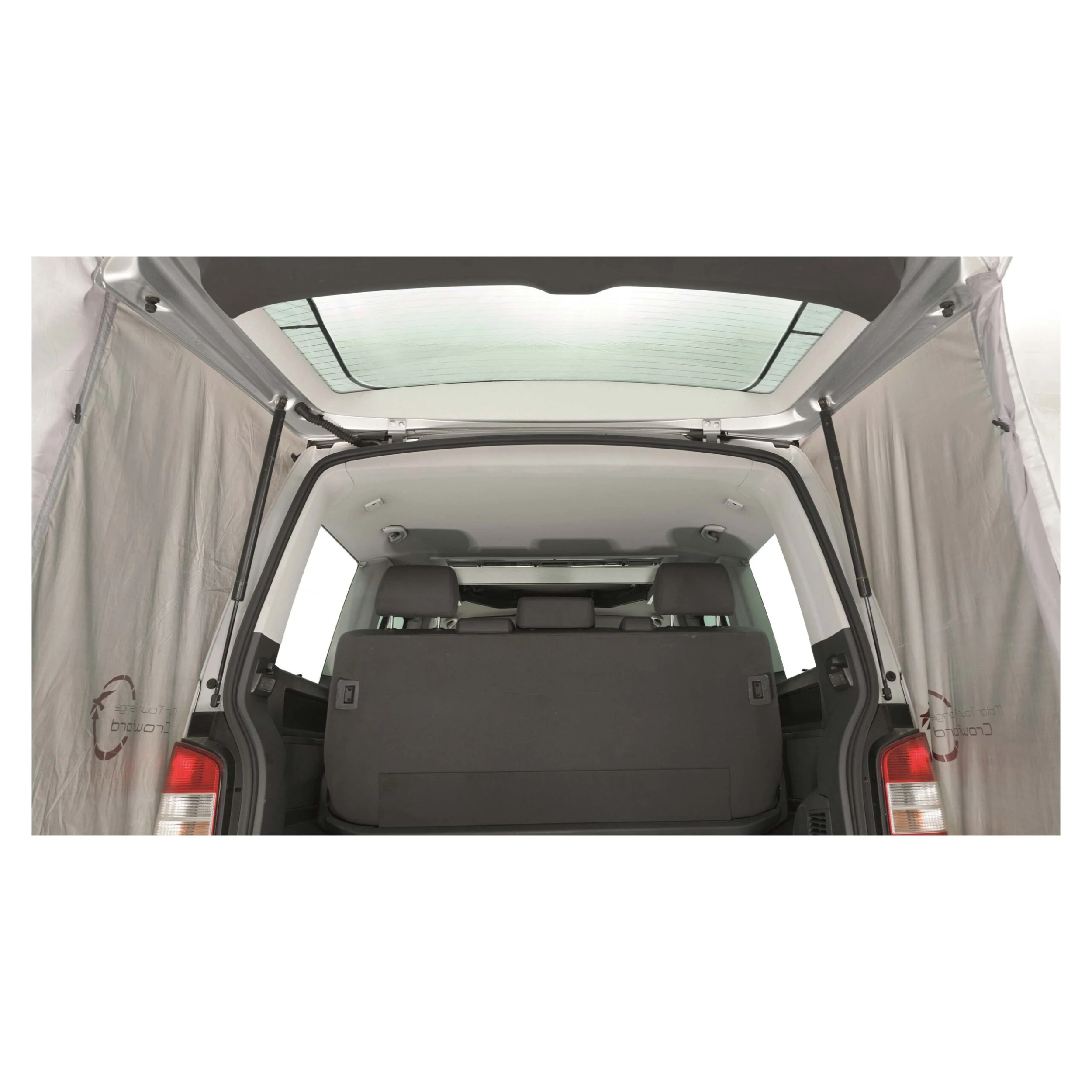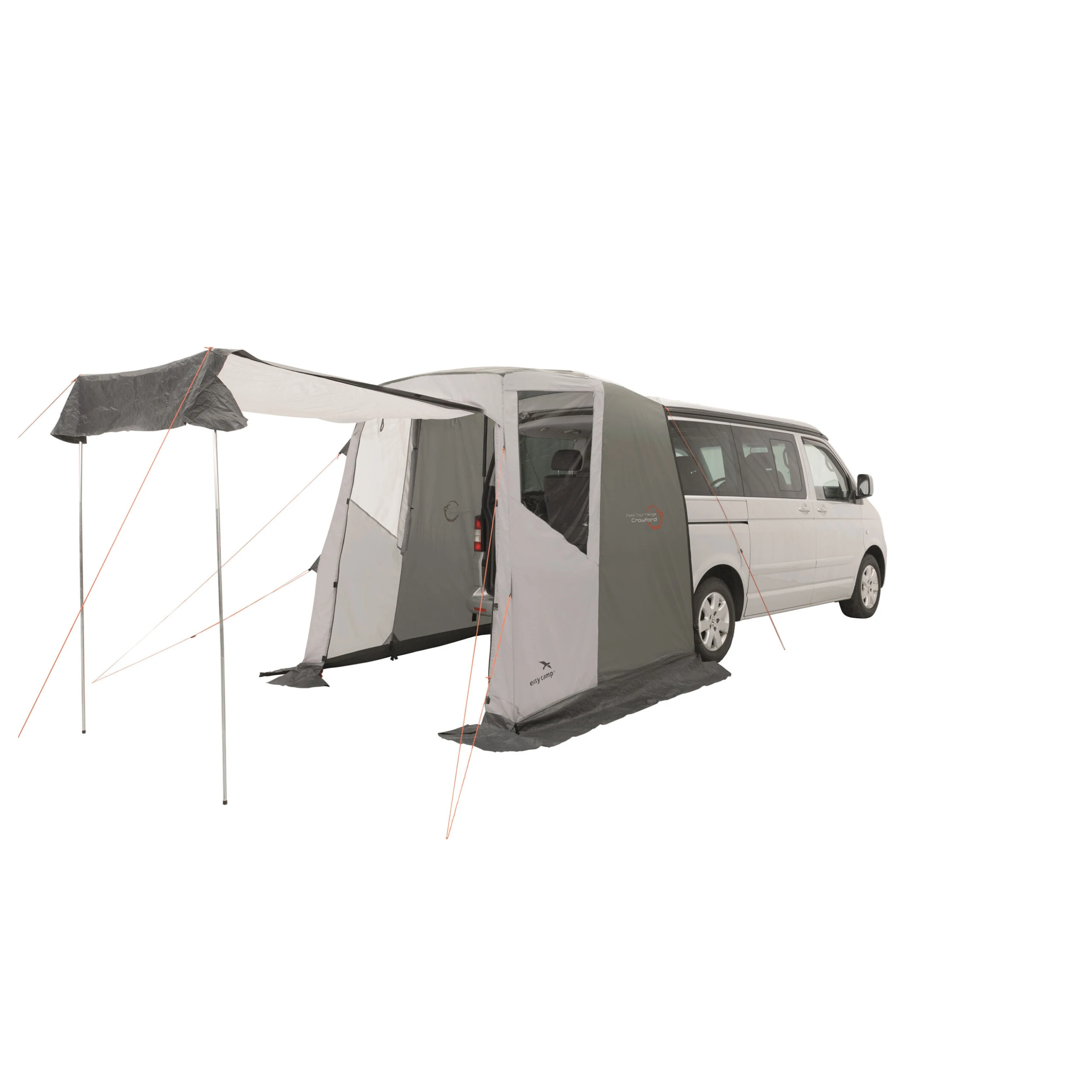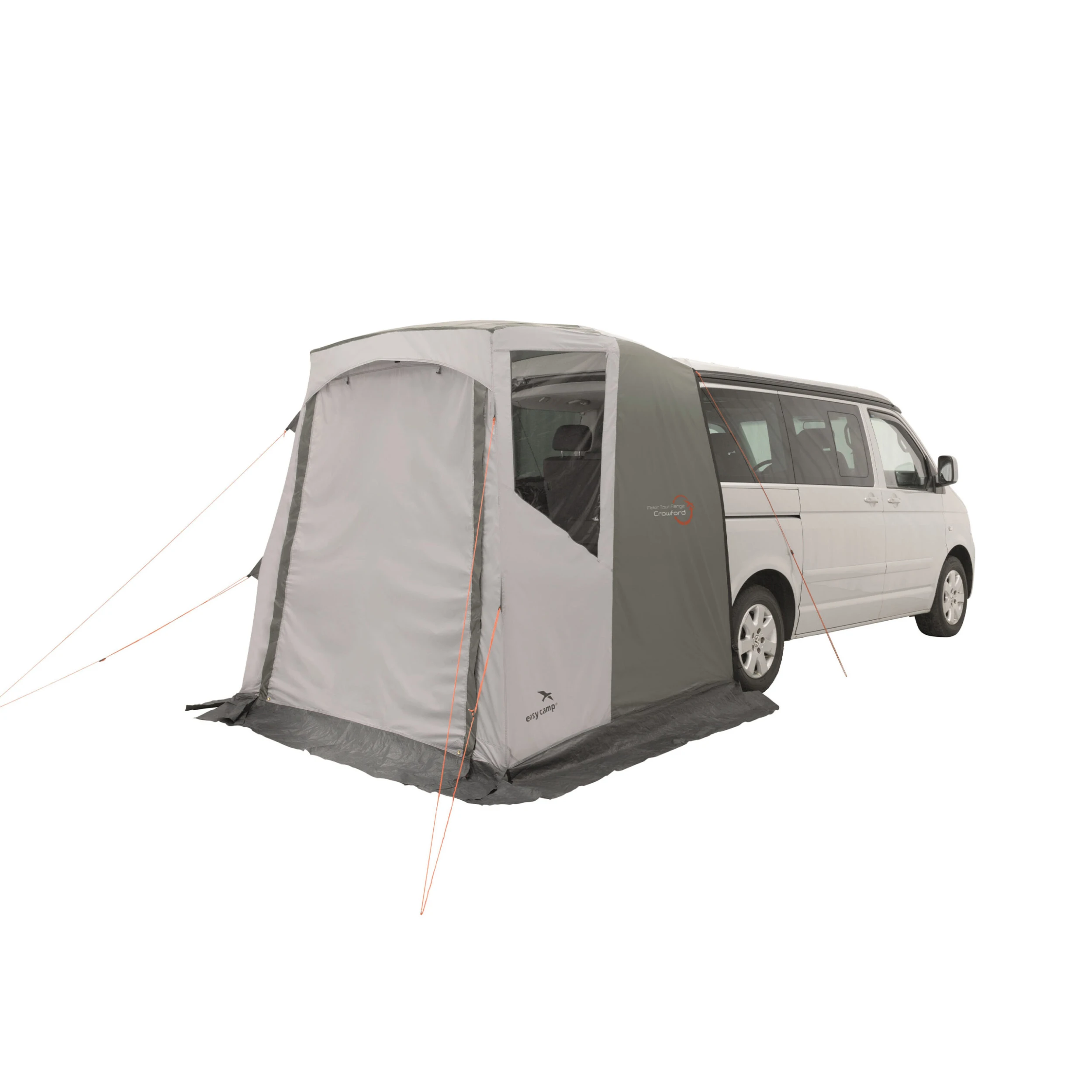 Die vielseitige Konstruktion des Easy Camp Heck-Vorzelt Crowford granite grey schafft flexibel nutzbaren Raum für Wohnmobile. Es ist die ideale Wahl für die VW T5/T6/T6.1 (Multivan, Caravelle, Transporter, California) und MB W447 (V-Class, Vito, Marco Polo). Mit zwei Abspannleinen wird es sicher an der Heckklappe befestigt. Darüber hinaus verfügt es über eine Tür mit angenehmer Durchgangshöhe, die zum Schutz vor Sonne und Regen hochgeklappt werden kann.