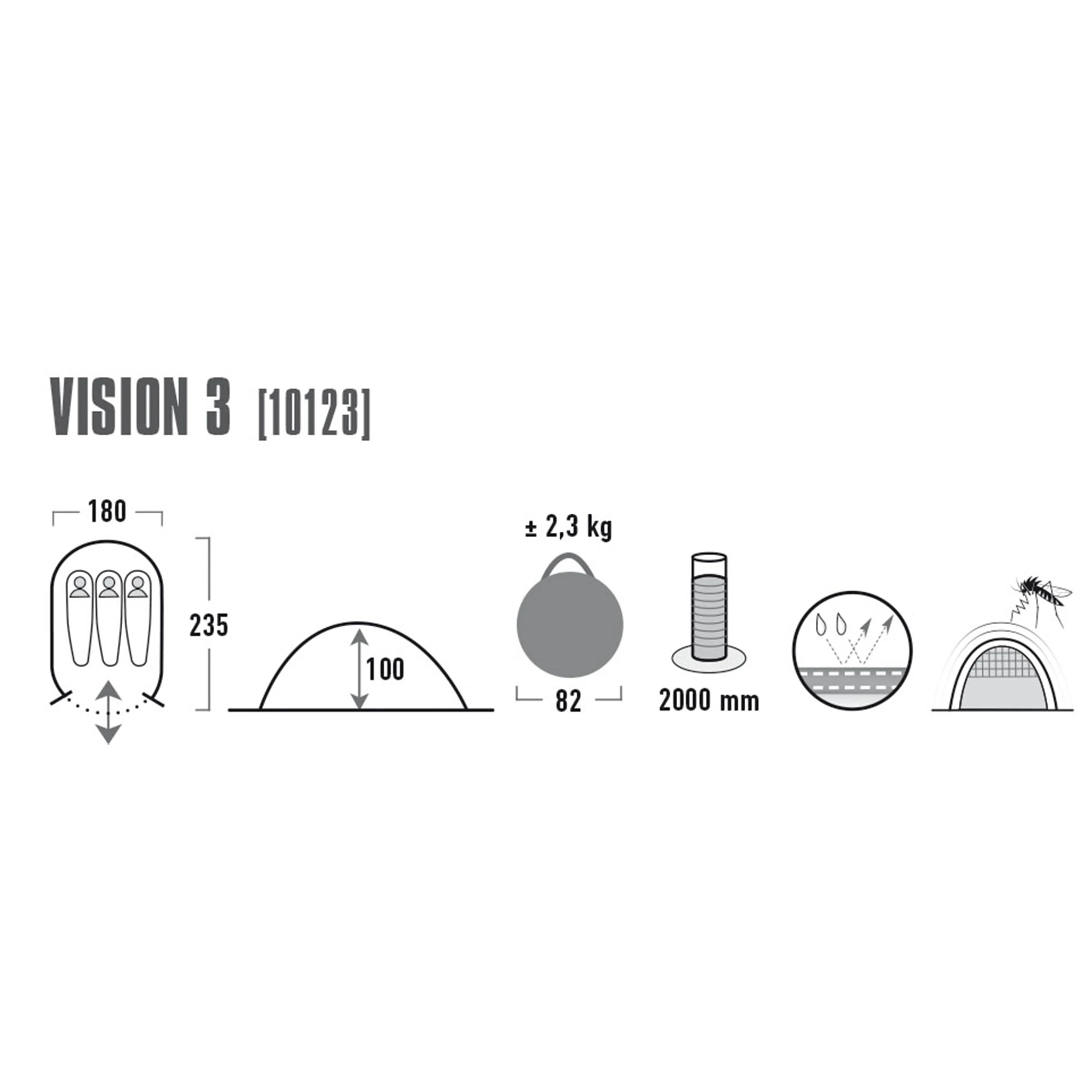 Dieses frei stehende Popup Zelt eignet sich dank seines geringen Gewichts von 2,4 kg perfekt für einen Wochenendausflug oder Festivalbesuch von drei Personen. Der Aufbau gestaltet sich einfach: Werfen Sie das Zelt hoch und schon steht Ihre Unterkunft. Ein integriertes Gestänge formt den Boden vor, wodurch ein zusätzliches Abspannen der Ecken nicht mehr nötig ist. Eine extra große Ventilation mit Abspann-Funktion und zwei Dauerventilationen mit Abstandhalter garantieren ein angenehmes Klima, während die mit ganzflächigen Moskitonetzen bespannten Eingänge einen Insektenschutz bieten. Die versiegelten Nähte sorgen dafür, dass das Vision 3 nicht nur wasserdicht ist, sondern auch eine große Reißfestigkeit mitbringt. Abgerundet wird der Innenbereich durch einen Lampenhalter und mehrere Innentaschen, in denen Sie beispielsweise Ihr Handy und Ihren Geldbeutel verstauen können. Die durchgehend gleiche Höhe sorgt zudem für ein komfortables Raumgefühl.