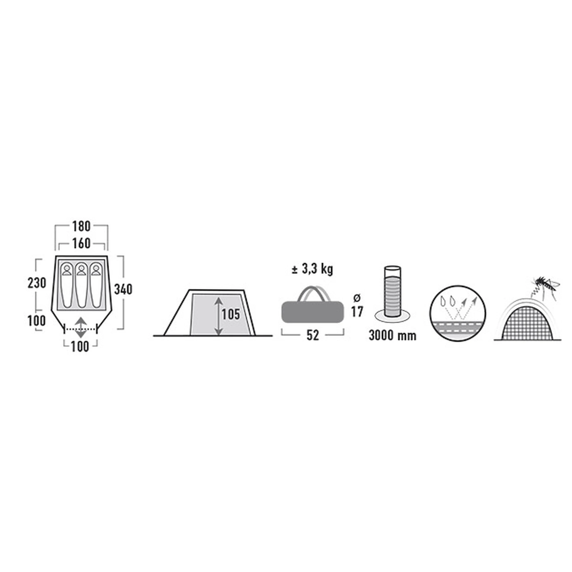 Bei einem Ausflug in die Natur bietet dieses Tunnelzelt drei Personen perfekten Unterschlupf. Ein schneller Aufbau ist durch die durchdachte Konstruktion, bei der Innen- und Außenzelt bereits miteinander kombiniert sind, garantiert. Das Fiberglas-Gestänge bietet Stabilität.