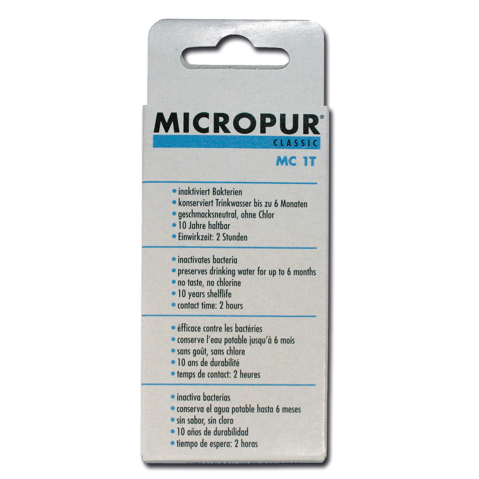 Die Katadyn Micropur Classic MC 1T 100 Stk. bewirken eine schnelle und wirkungsvolle Wasserdesinfektion für klares Wasser und sind somit ideal für Dein nächstes Outdoor-Abenteuer. Dank der Silberionen schützen sie bis zu 6 Monate vor Wiederverkeimung. Bei trübem Wasser solltest Du die Tabletten in Kombination mit einem Filter einsetzen.