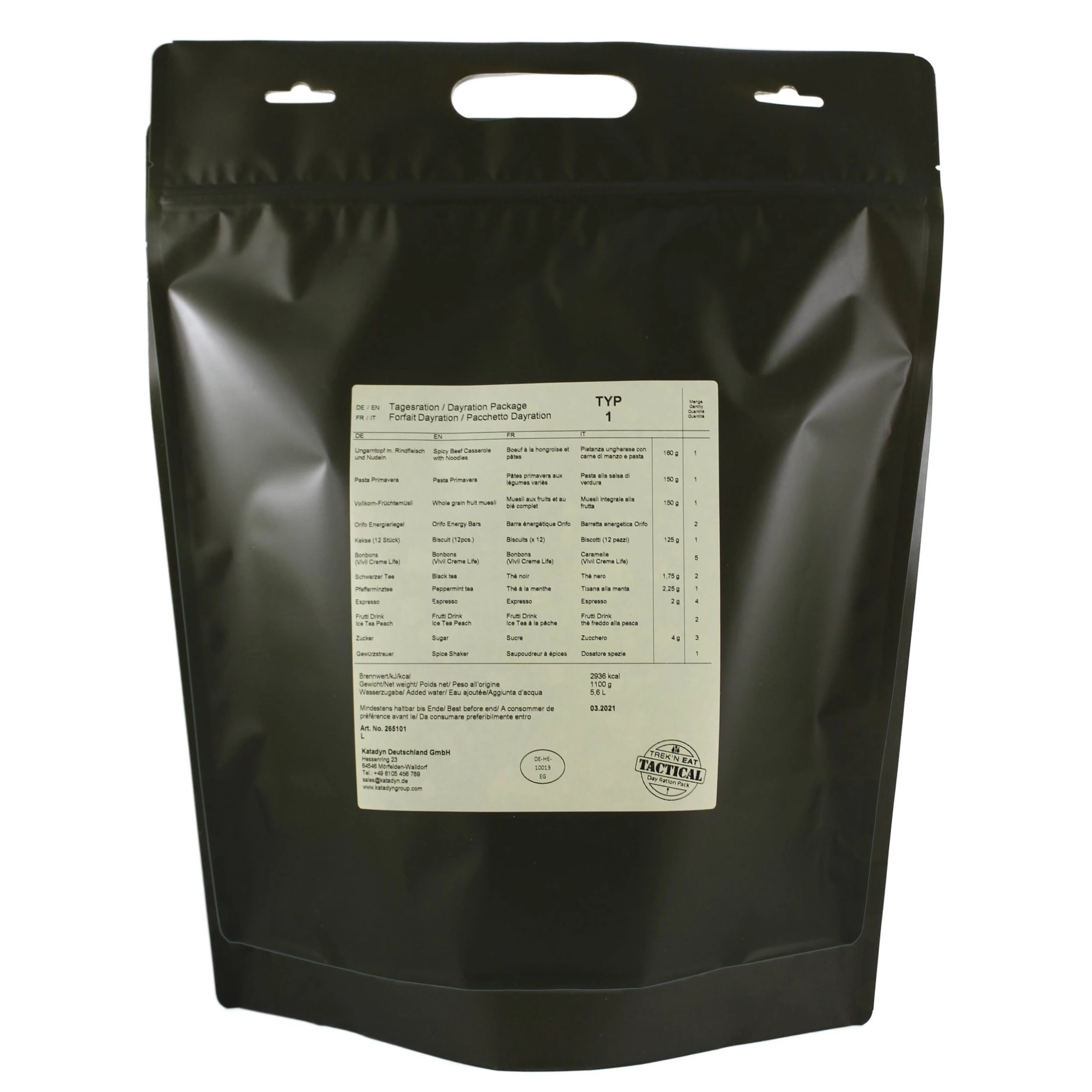 Die Katadyn Tagesration Day Ration Typ 1 ist ein zusammengesetztes Verpflegungspaket für eine Person für einen Tag. Es erfüllt die Anforderungen an eine optimale Ernährung unter extremen Bedingungen.