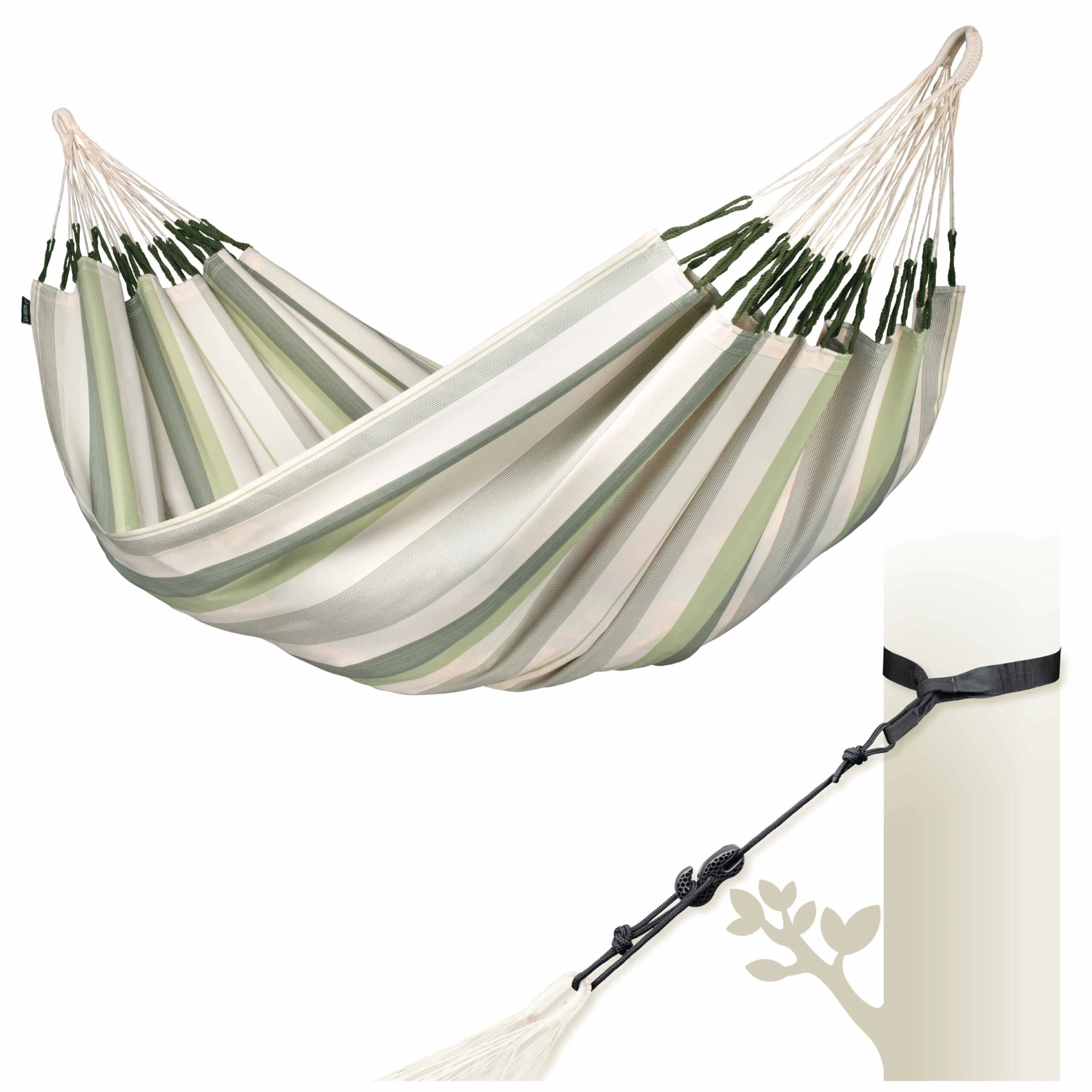 Die robuste La Siesta Doppel-Hängematte Brisa ist der ideale Begleiter für Ihre Reisen. Sie ist schnell trocknend und wetterbeständig. Aufgrund der Verdopplung der Schussfäden an den Webkanten wird die Liegefläche verstärkt. Daher ist sie besonders reißfest. Besonders einfach und sicher ist der MultiSpot, der das Gewicht auf vier Bohrlöcher verteilt.