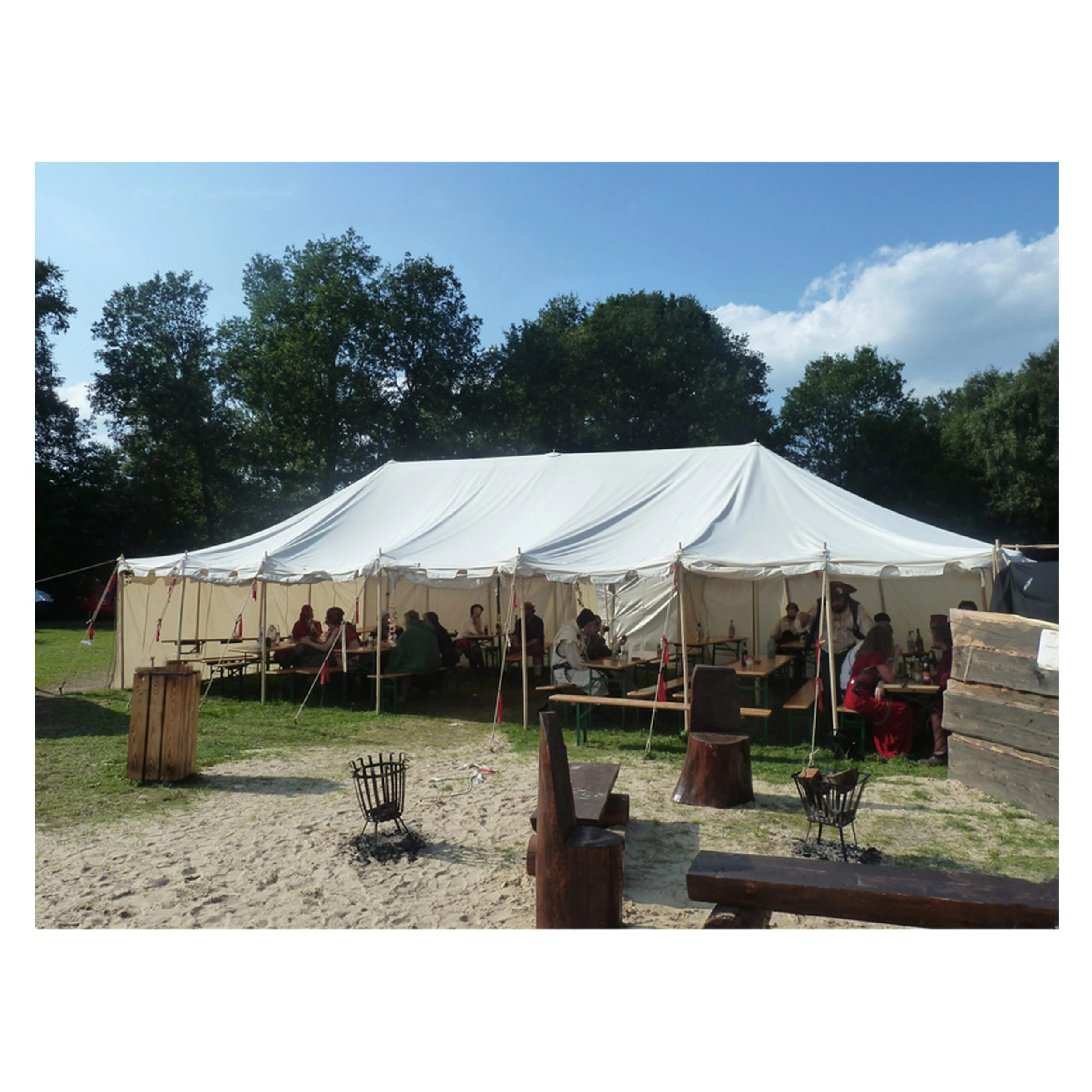 Dieses Dreimasterzelt bietet reichlich Platz für bis zu 35 Personen. Der verschließbare Zugangsbereich verfügt über ein Vordach. Mit einer Grundfläche von 72 qm kann es noch ohne Abnahme durch zuständige Ämter aufgebaut werden und ist so ideal für größere Veranstaltungen geeignet.