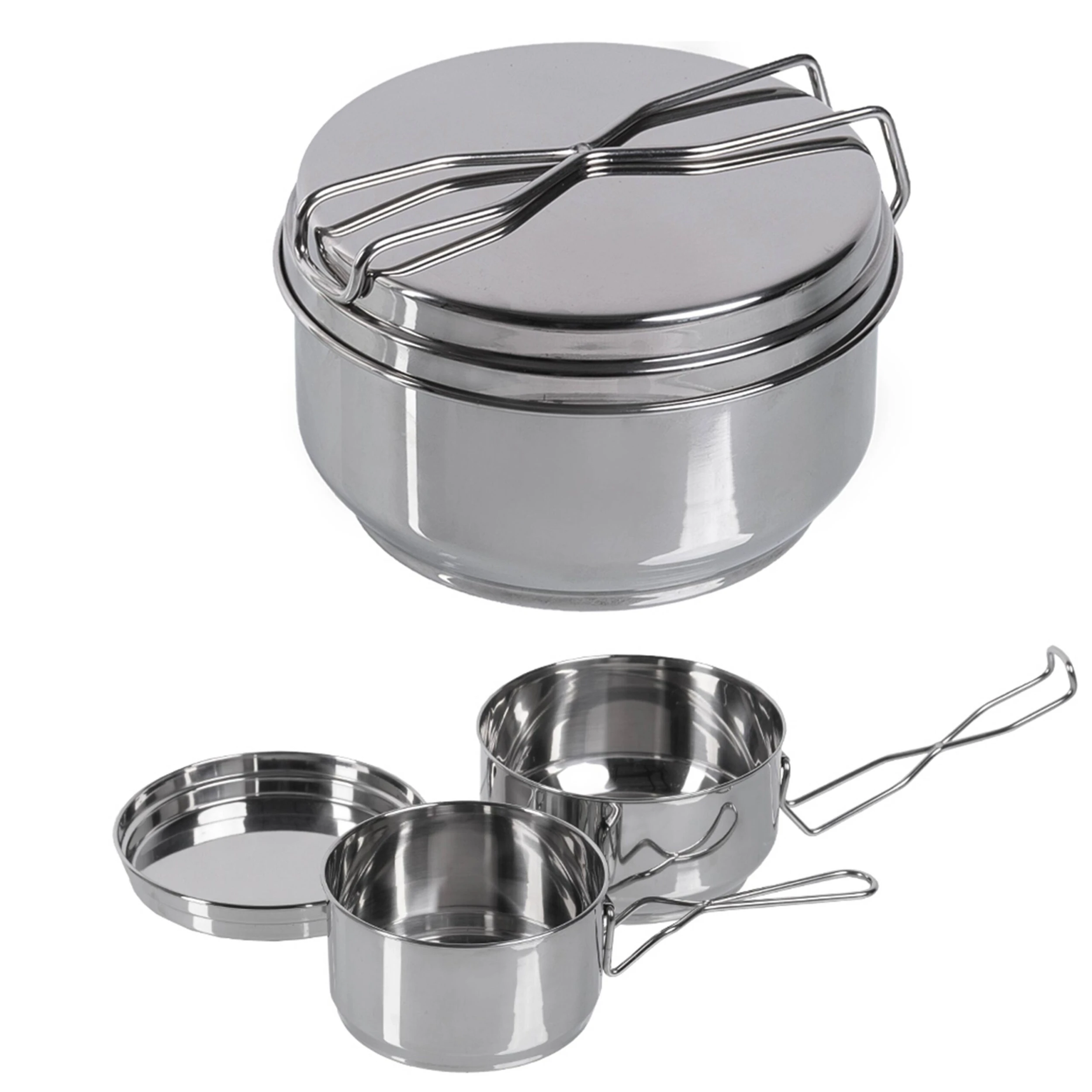 Der Nachbau des Tschechischen Kochgeschirrs wurde in robustem und langlebigem Edelstahl gefertigt. Das Set besteht aus zwei Pfannen und einem Deckel, der auch als Teller verwendet werden kann. Bei Nichtgebrauch und zum Transport lässt sich das Set platzsparend zusammenklappen und in mitgelieferten Netzbeutel verstauen. Die ausklappbaren Griffe erleichtern den Umgang mit dem Geschirr.