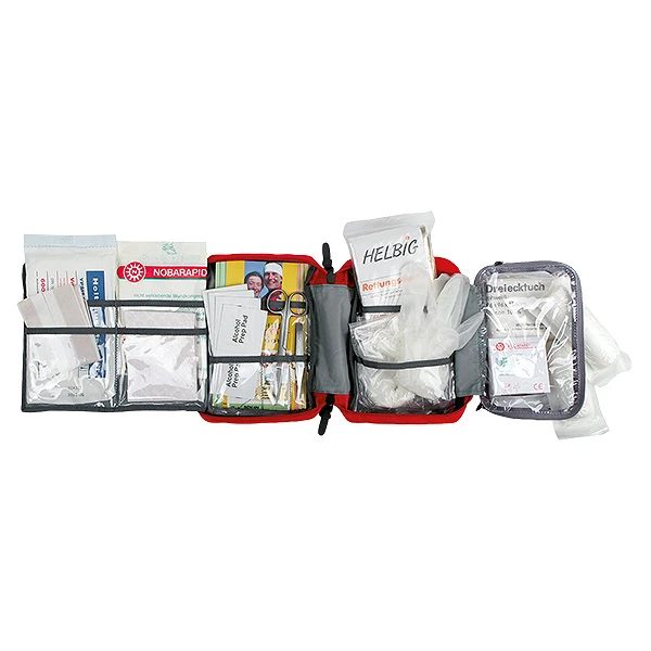 Das Tatonka First Aid Kit Complete eignet sich perfekt für ein bis vier Personen, die einen Ausflug von bis zu sieben Tagen planen und empfiehlt sich vor allem zur Mitnahme, wenn schnelle ärztliche Versorgung nicht gewährleistet ist. Die Erste Hilfe-Tasche mit Handgriff bietet ein unterteiltes Hauptfach, welches mit einem umlaufenden Reißverschluss gesichert wird. Hierin befinden sich beispielsweise eine Checkliste, die Sie vor der Tour durchgehen können, und ein Spickzettel, der die wichtigsten Regeln zur Erstversorgung in der Natur auflistet. Das Set kann im Rucksack verstaut oder dank der sich auf der Rückseite befindlichen Hypalon-Schlaufe sowohl vertikal wie auch horizontal am Gürtel befestigt werden. Das Material macht es reißfest und wasserundurchlässig.
