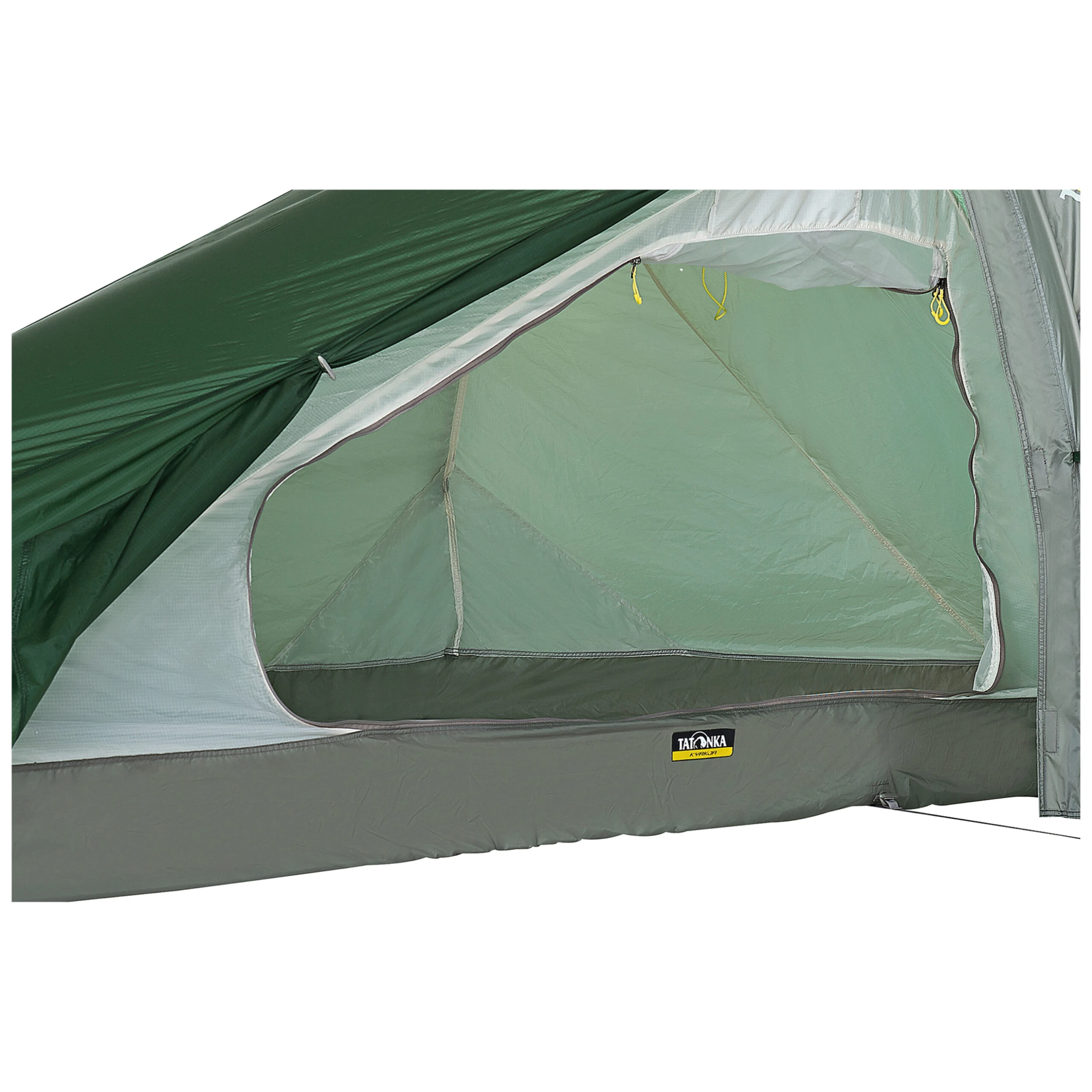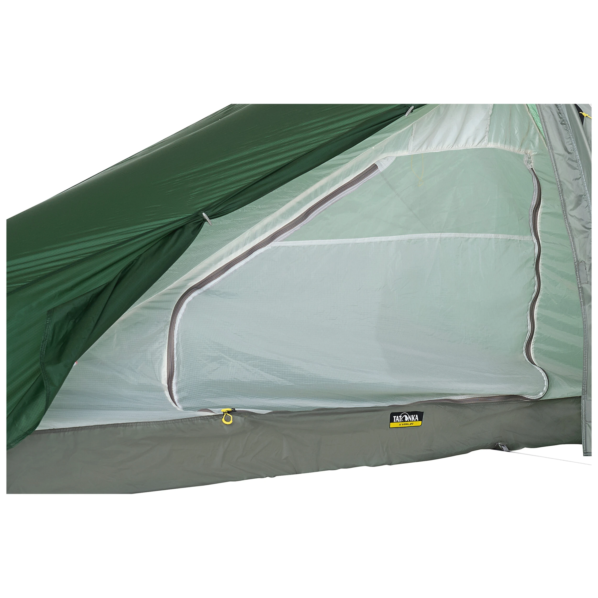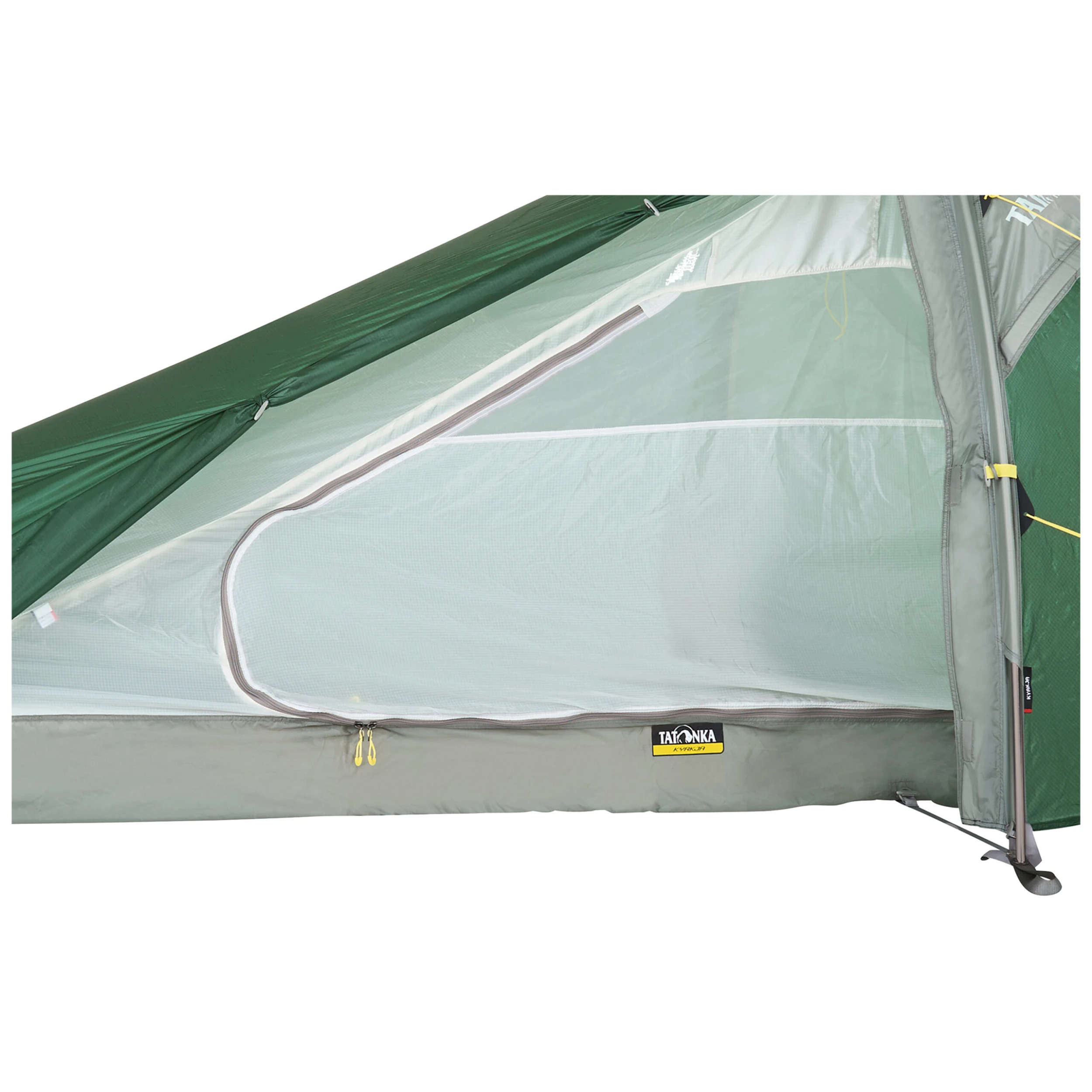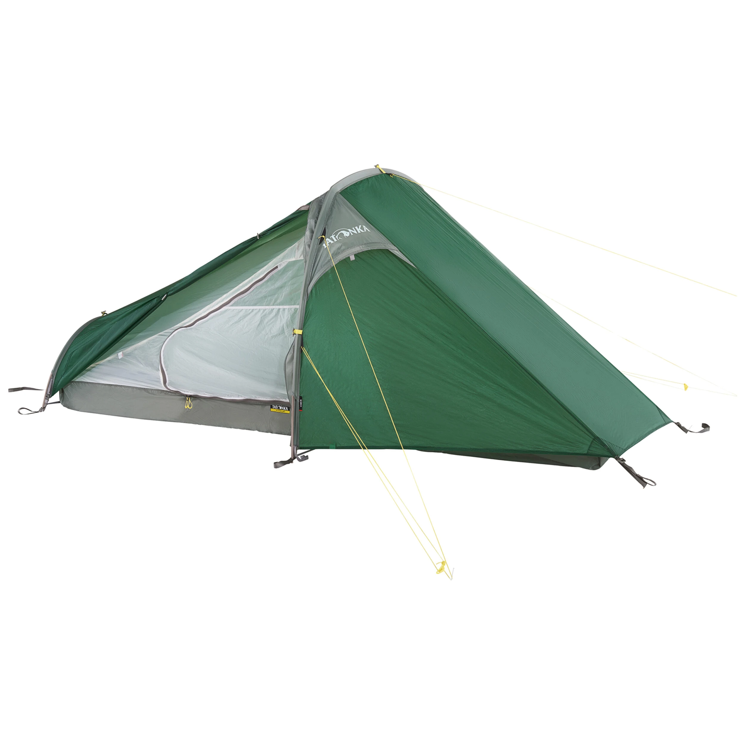 Das Tatonka Tunnelzelt Kyrkja ist ein einfach aufbaubares Einpersonenzelt. Es wird mit einem großen und einem kleinen Gestängebogen aufgebaut, sodass der hintere Teil vergrößert ist und zusätzlichen Platz bietet. Die am Seiteneingang vorhandene Apsis kann als Abstellplatz für Rucksack und Schuhe verwendet werden.
