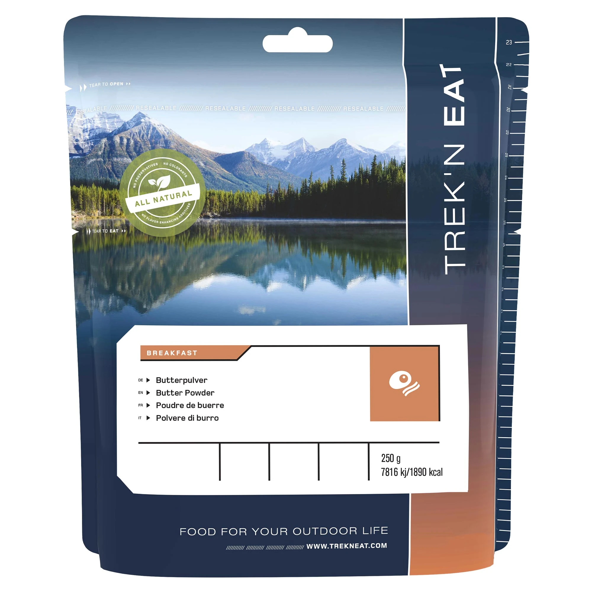 Das Trek’N Eat Butterpulver überzeugt mit gutem Geschmack und langer Haltbarkeit. Es versorgt Dich mit der benötigten Energie und eignet sich für Ausflüge wie auch für die Krisenvorsorge, als Teil Deiner Notnahrung oder als Backup im Rucksack oder Auto.